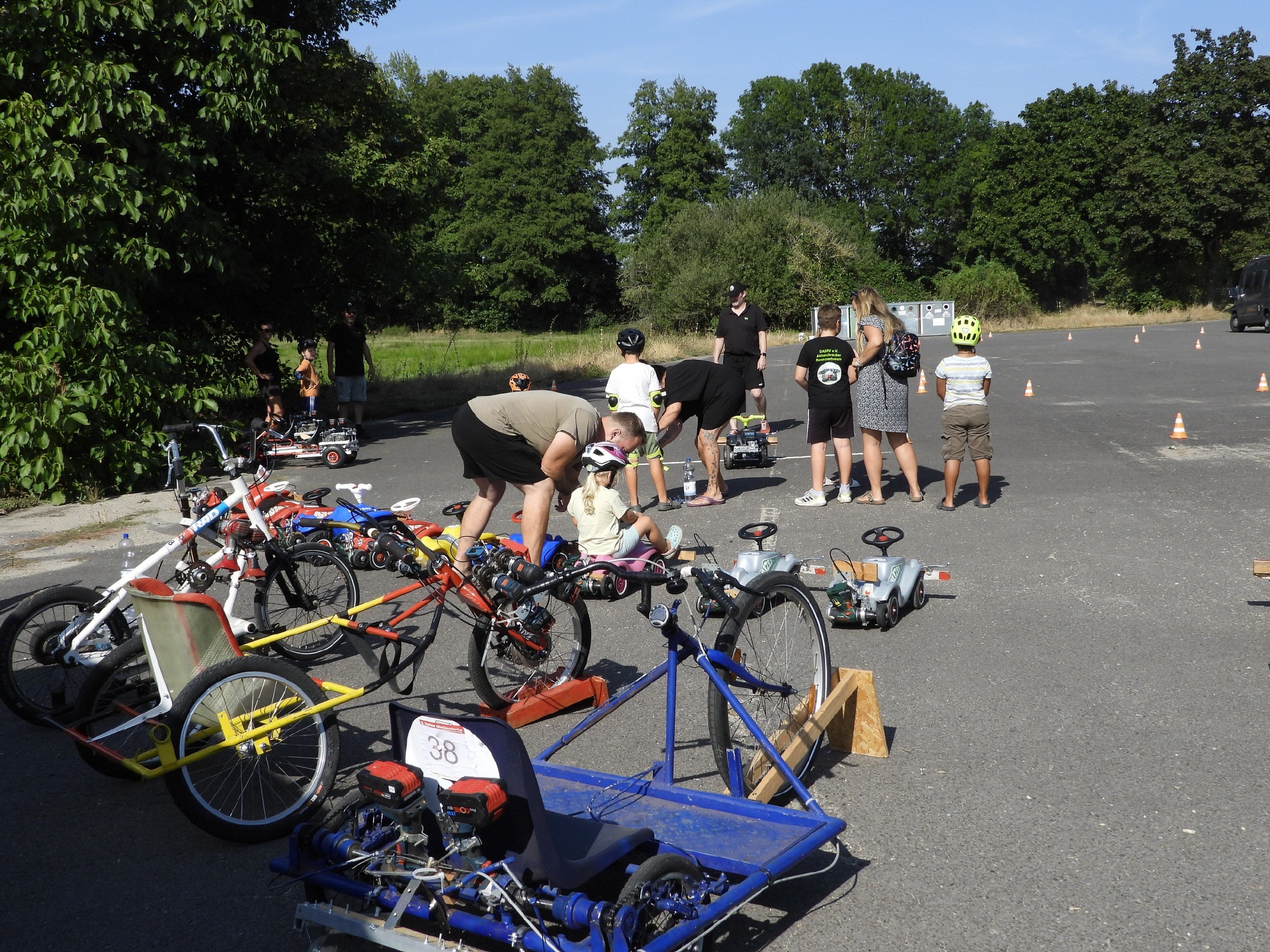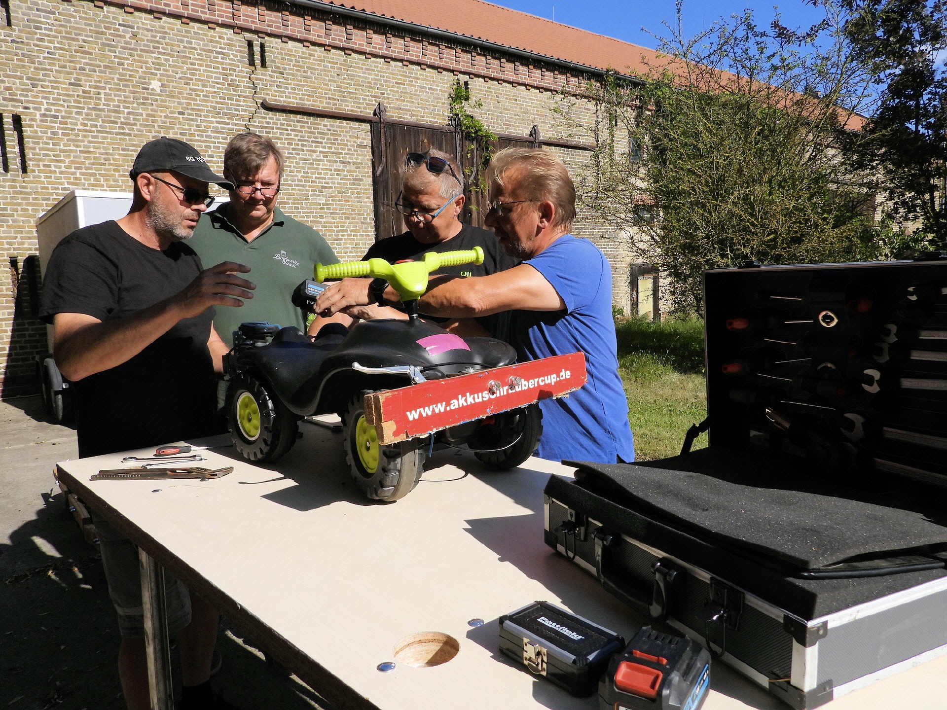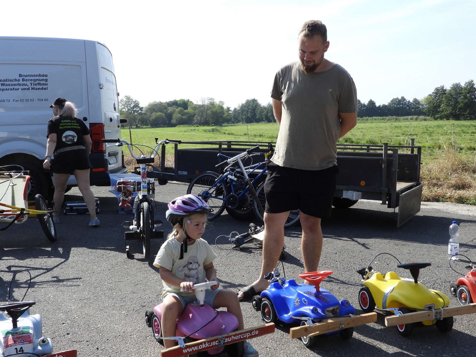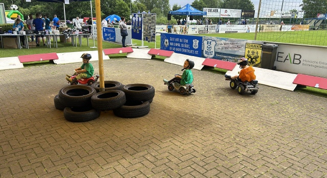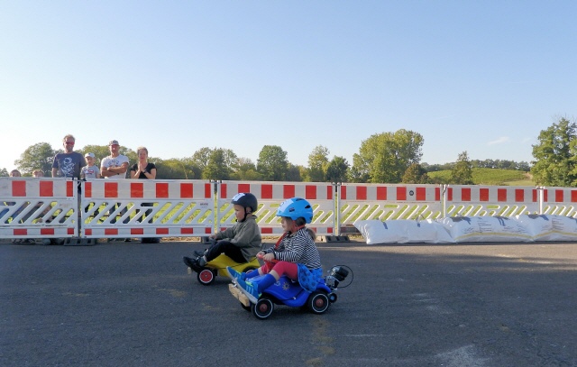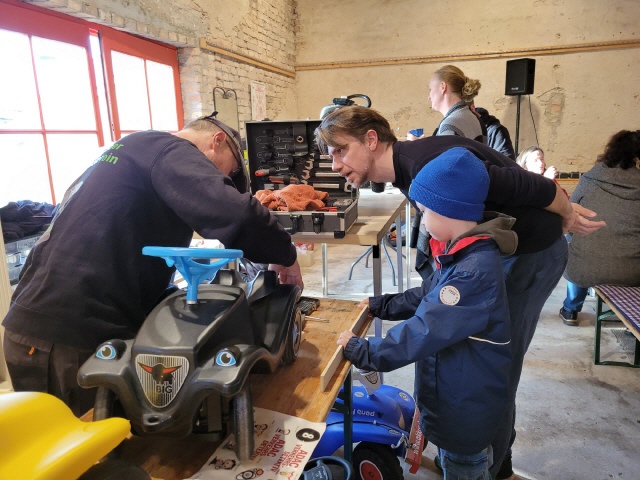 Bei der kleinsten Rennklasse (BobbyCars) kam sogar eine Familie mit einem eigenen „Rohling“. Eigentlich war nur die Lenkung zu justieren und der Papa wollte sich ein paar Tricks abholen. Da der Akkuschrauberverein aber auch alte ausrangierte Fahrzeuge dabei hatte, wurde gemeinsam mit Papa und Sohn das mitgebrachte BobbyCar zur Rennmaschine umgerüstet. Nach knapp einer Stunde konnte der kleine Rennfahrer bereits seine ersten Runden fahren und die glücklichen Augen strahlten.