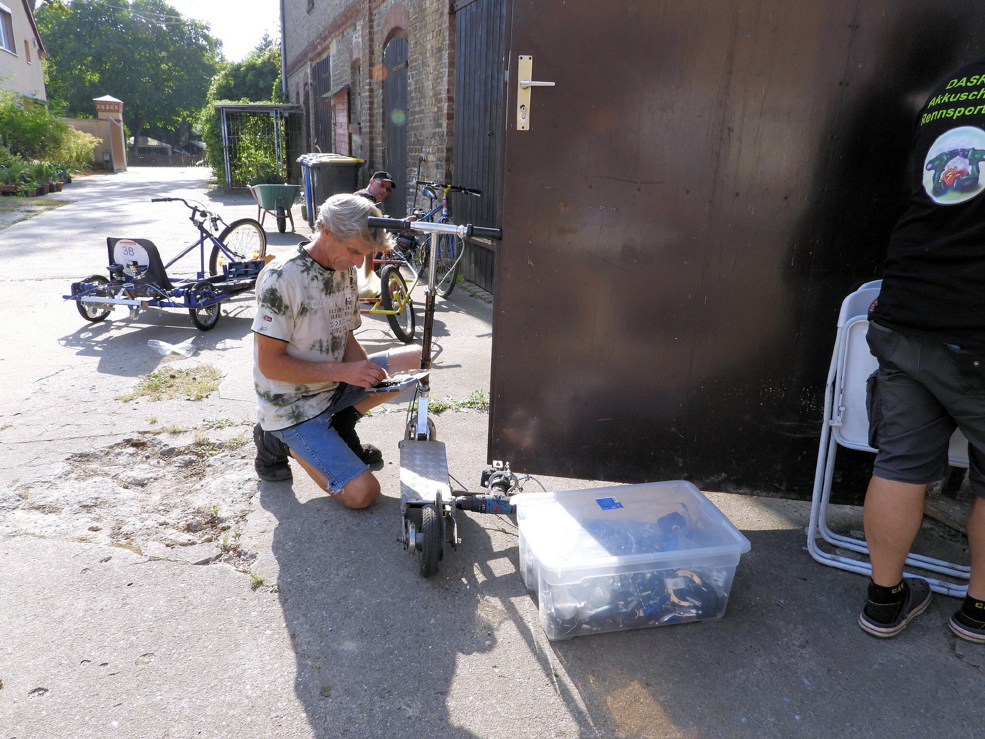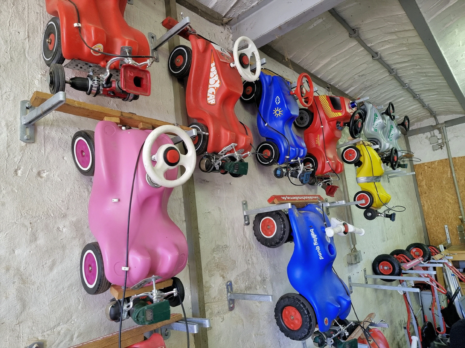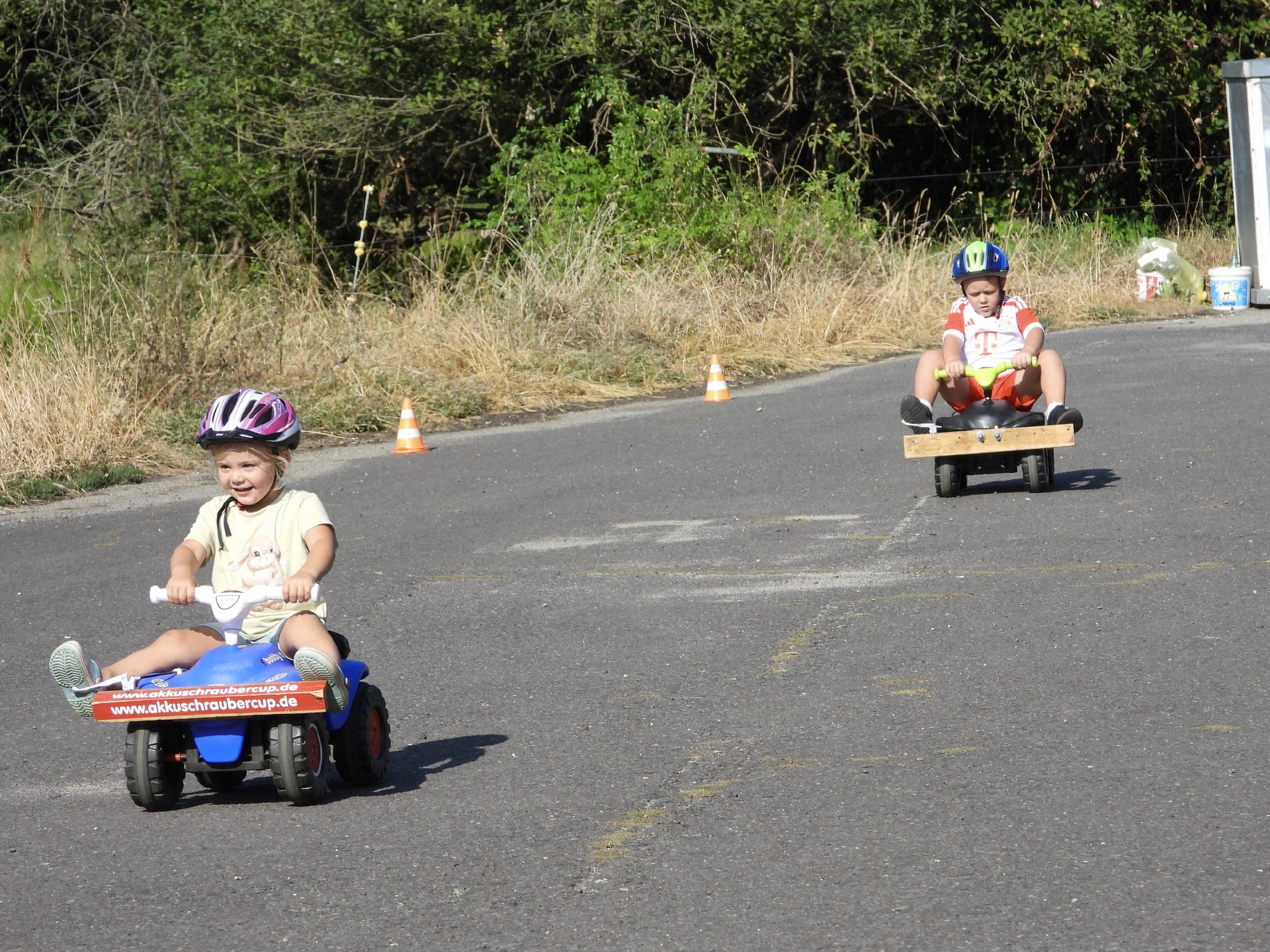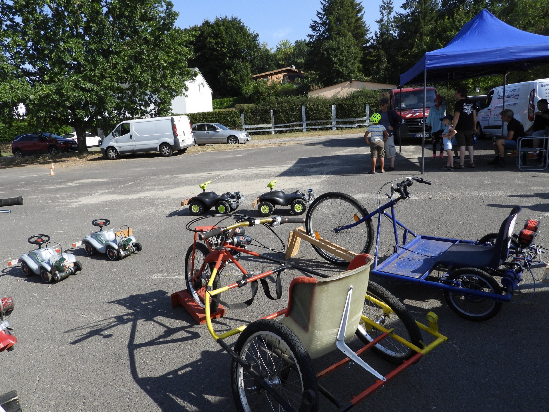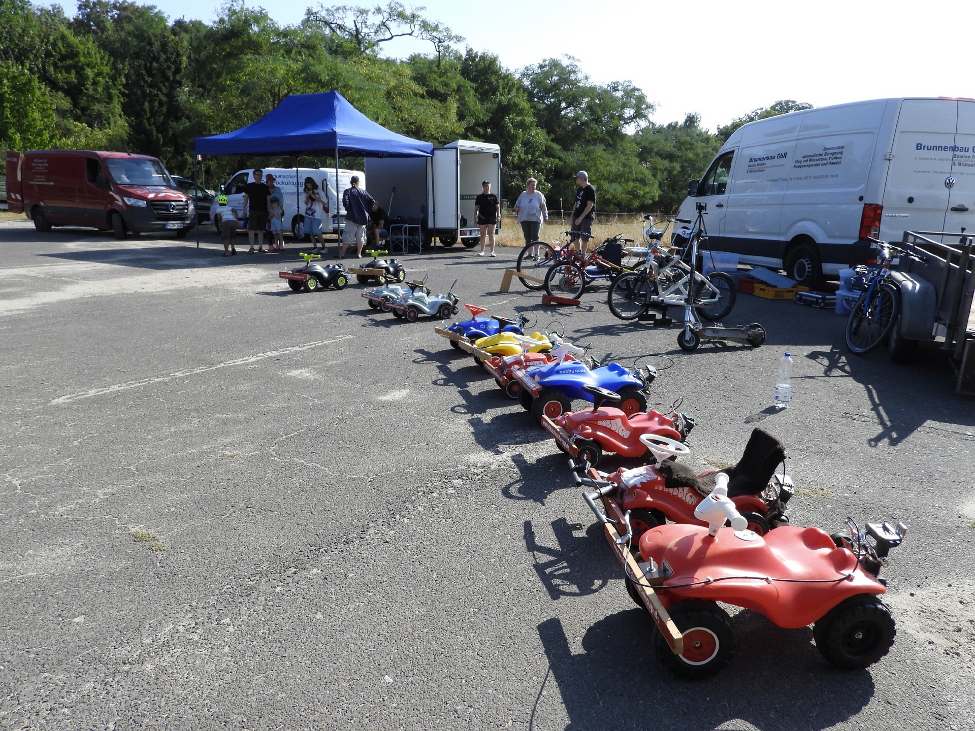 Bei der kleinsten Rennklasse (BobbyCars) kam sogar eine Familie mit einem eigenen „Rohling“. Eigentlich war nur die Lenkung zu justieren und der Papa wollte sich ein paar Tricks abholen. Da der Akkuschrauberverein aber auch alte ausrangierte Fahrzeuge dabei hatte, wurde gemeinsam mit Papa und Sohn das mitgebrachte BobbyCar zur Rennmaschine umgerüstet. Nach knapp einer Stunde konnte der kleine Rennfahrer bereits seine ersten Runden fahren und die glücklichen Augen strahlten.