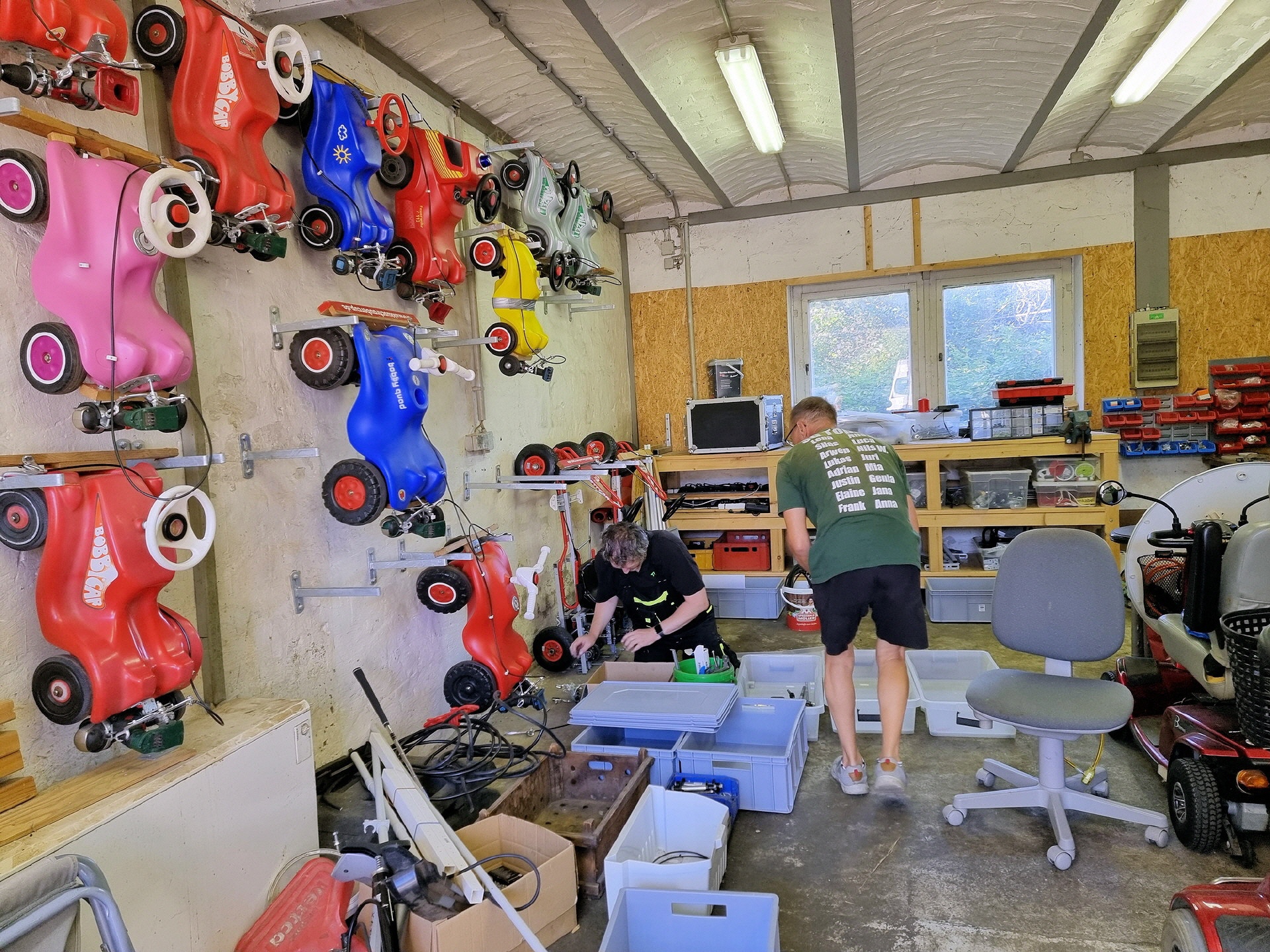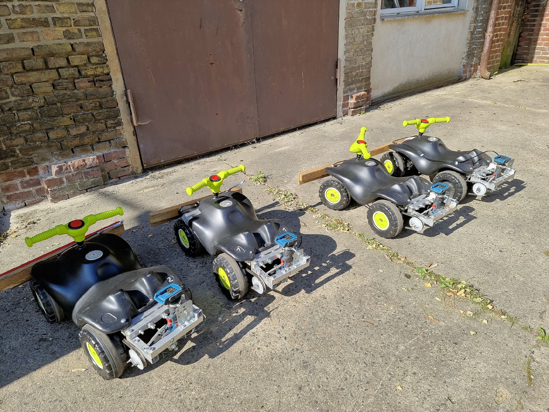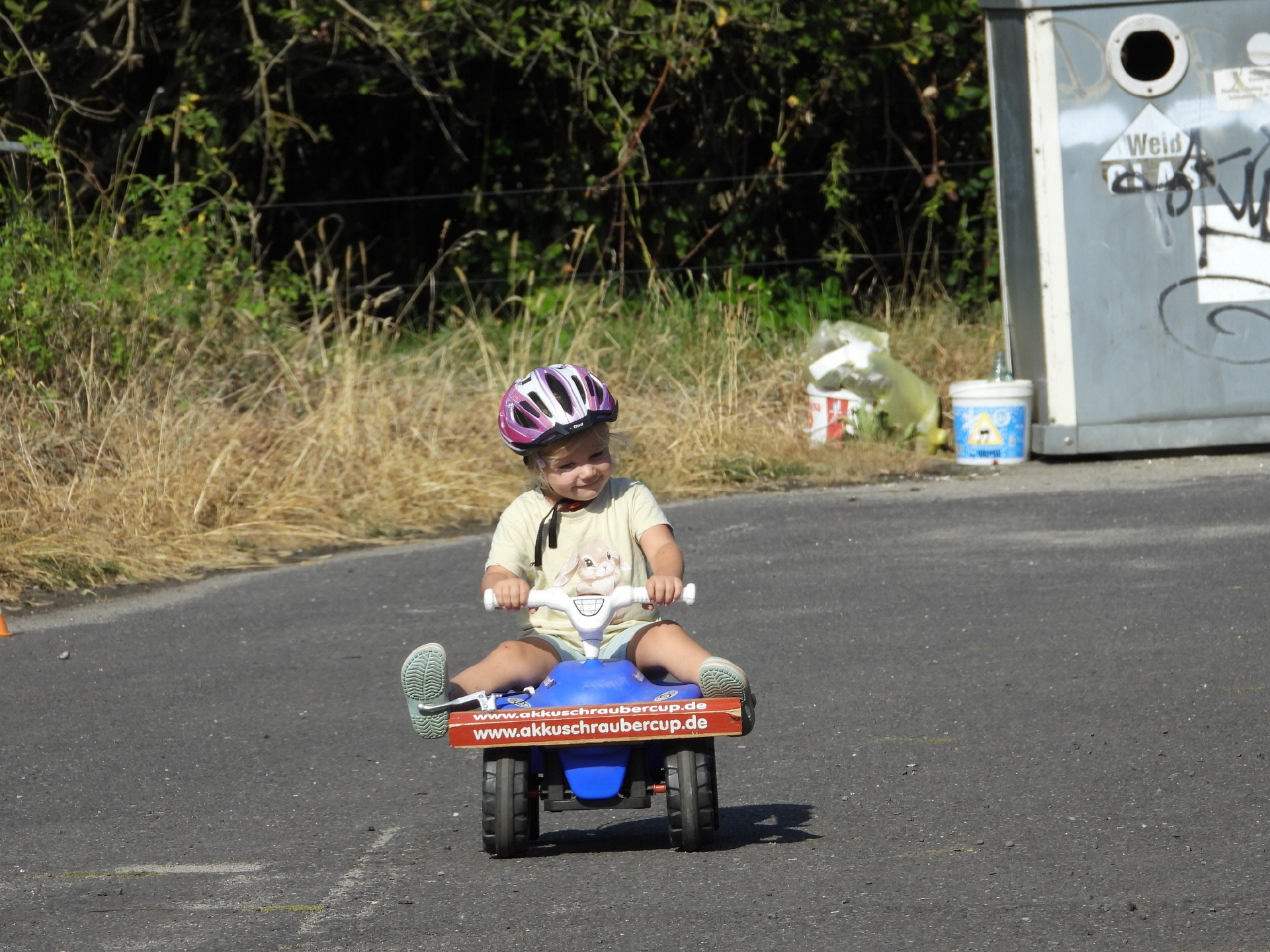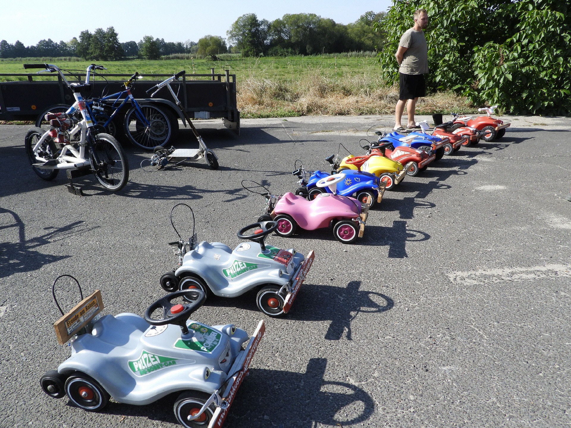 Bei der kleinsten Rennklasse (BobbyCars) kam sogar eine Familie mit einem eigenen „Rohling“. Eigentlich war nur die Lenkung zu justieren und der Papa wollte sich ein paar Tricks abholen. Da der Akkuschrauberverein aber auch alte ausrangierte Fahrzeuge dabei hatte, wurde gemeinsam mit Papa und Sohn das mitgebrachte BobbyCar zur Rennmaschine umgerüstet. Nach knapp einer Stunde konnte der kleine Rennfahrer bereits seine ersten Runden fahren und die glücklichen Augen strahlten.