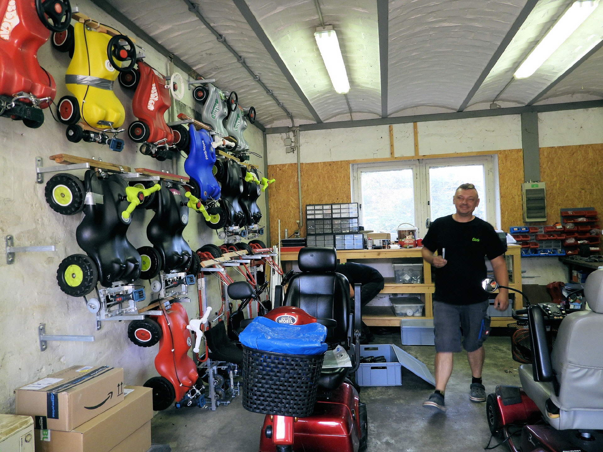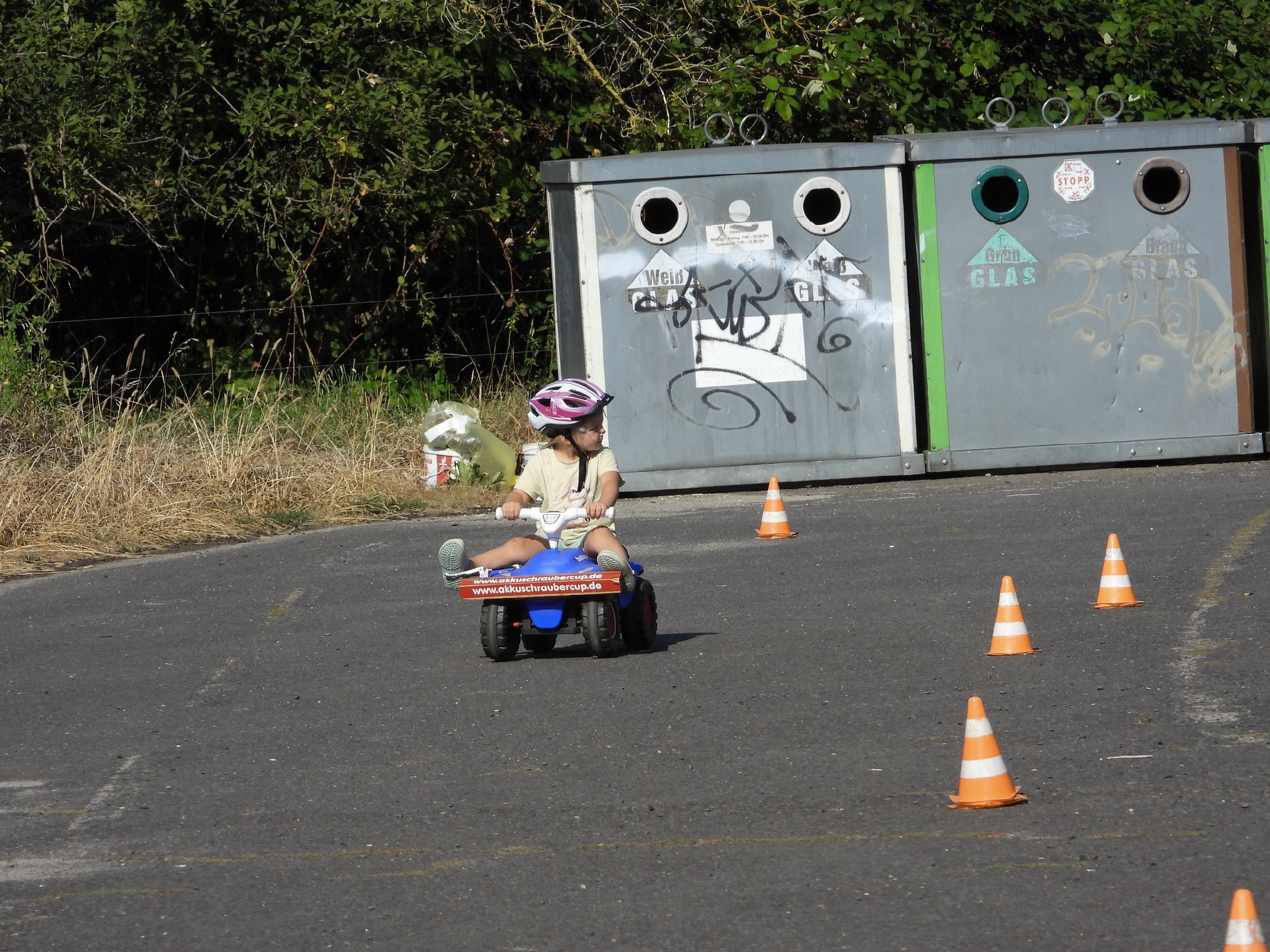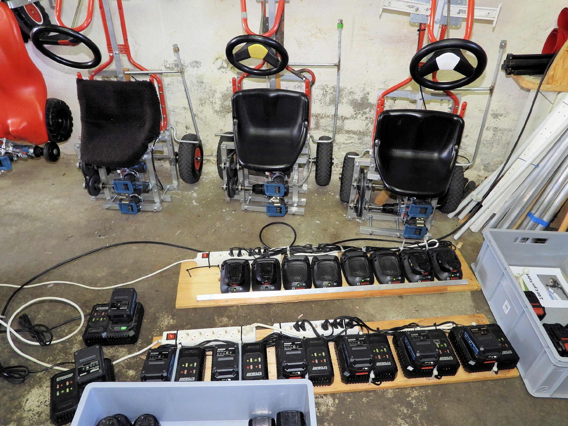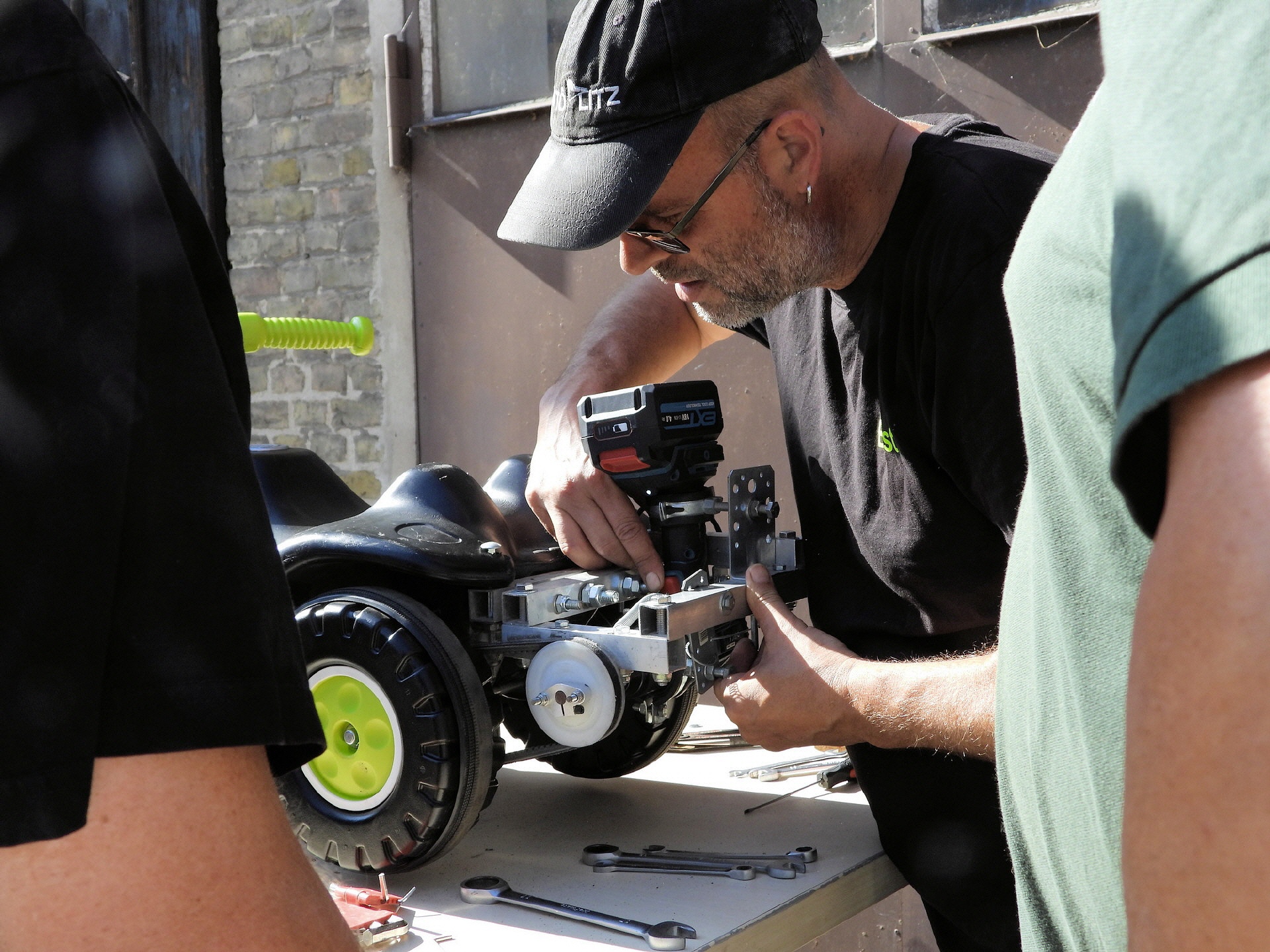 Bei der kleinsten Rennklasse (BobbyCars) kam sogar eine Familie mit einem eigenen „Rohling“. Eigentlich war nur die Lenkung zu justieren und der Papa wollte sich ein paar Tricks abholen. Da der Akkuschrauberverein aber auch alte ausrangierte Fahrzeuge dabei hatte, wurde gemeinsam mit Papa und Sohn das mitgebrachte BobbyCar zur Rennmaschine umgerüstet. Nach knapp einer Stunde konnte der kleine Rennfahrer bereits seine ersten Runden fahren und die glücklichen Augen strahlten.