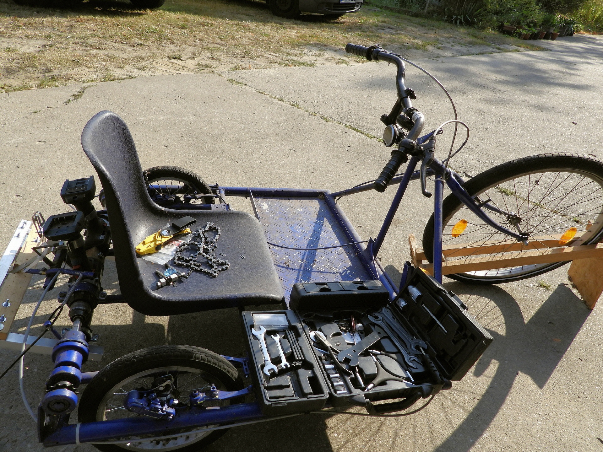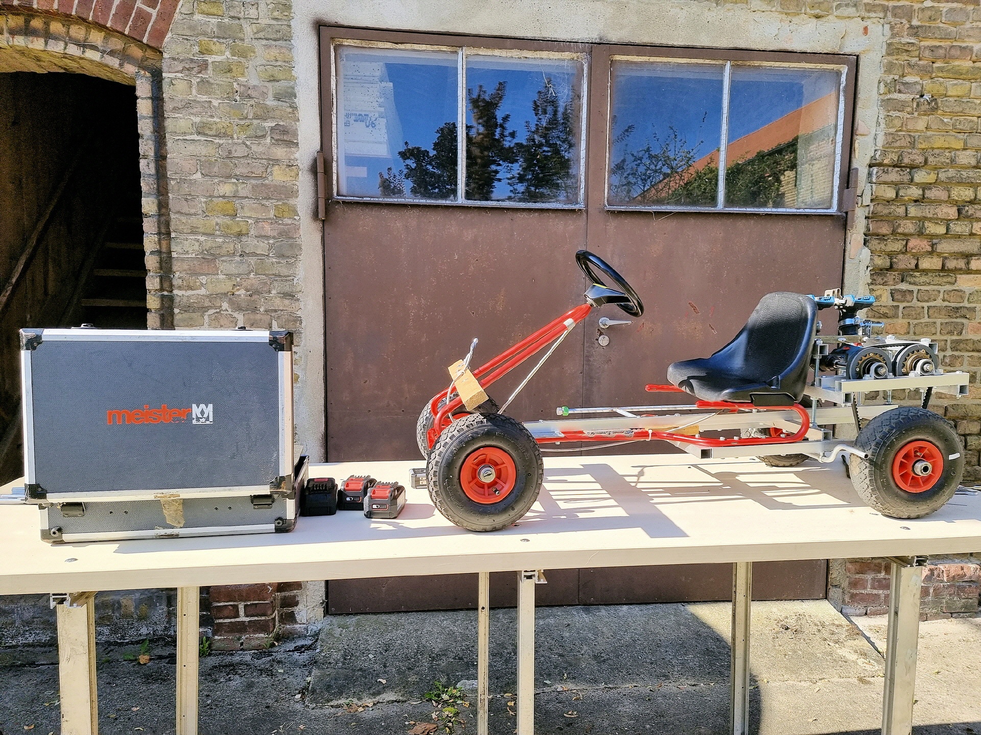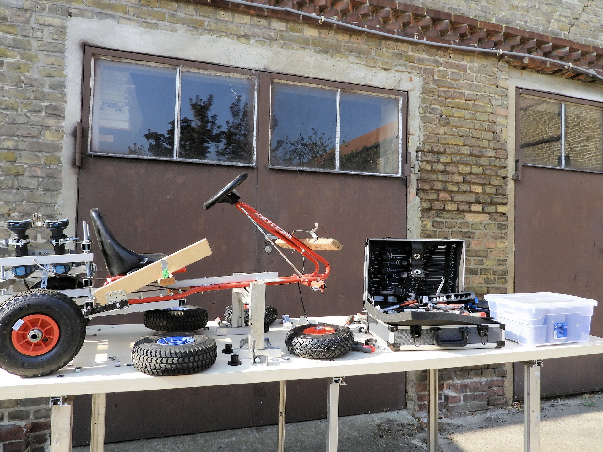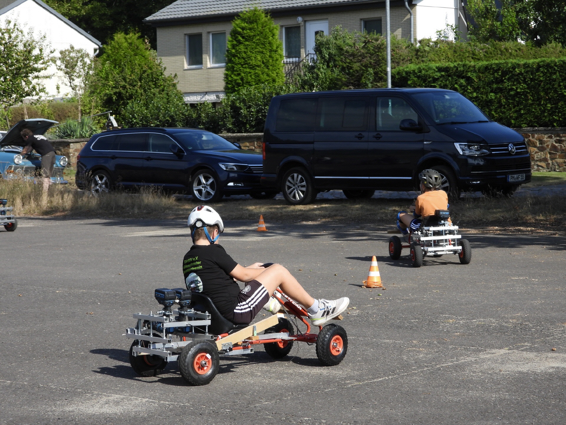 In der KettCar-Klasse standen umfangreiche Umbauarbeiten an. Nach 5 Jahren gaben die Vorderachsen nach und die Lenkungsteile sowie Vorderräder wurden ausgetauscht. Auch die Bremsanlage wurde optimiert. Hier war von Vorteil, dass „Bulli“ seinen kompletten Werkstattwagen mitgebracht hat.